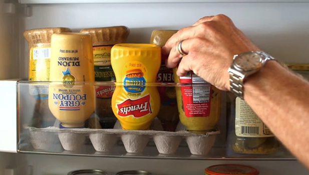 Nếu các ngăn đựng đồ ở cánh cửa của tủ lạnh bị xếp chật cứng với đủ loại chai lọ, bạn hãy sử dụng khay đựng trứng để đặt các loại chai lọ nước sốt. Cách sắp xếp này vừa đỡ tốn diện tích, vừa ngăn nắp gọn gàng.
